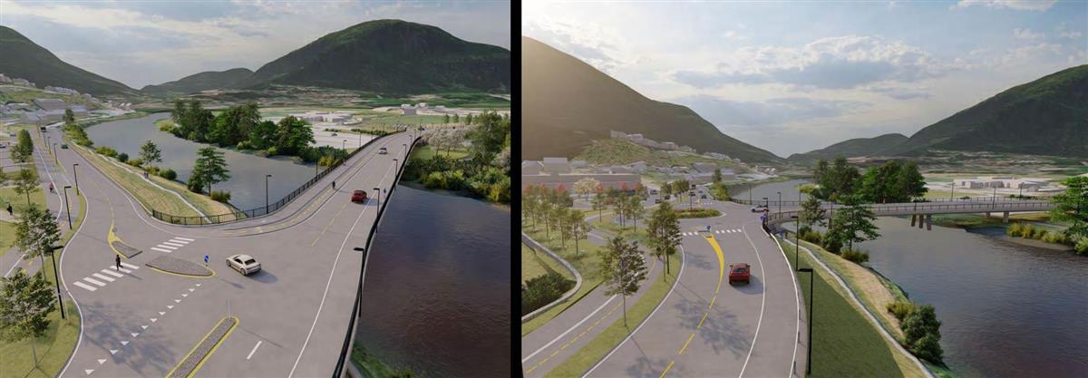 To alternative løysingar er ute på høyring. Med T-kryss til venstre og med rundkøyring som i illustrasjonen til høgre.Planframlegget legg til rette for gate med sykkelveg og fortau frå rundkøyringa på Hafstad og til Angedalsvegen. Dette inkluderer bru over Jølstra. Planen er utarbeidd i to alternative løysingar; eitt med T-kryss (alt. 10) og eitt med rundkøyring (alt. 13).
